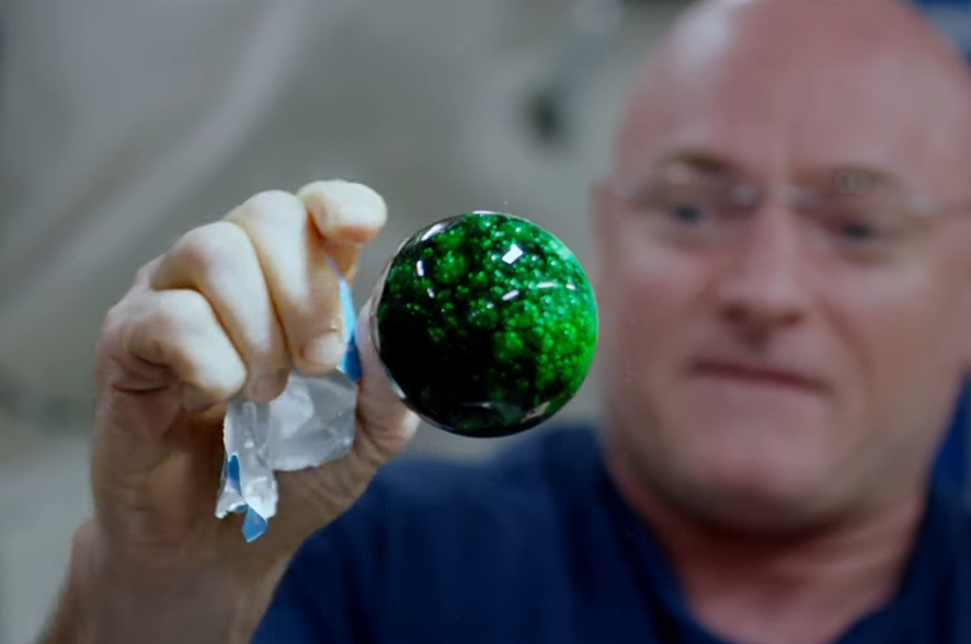 Scott Kelly, astronaut, with a sphere of green liquid. Chris Hadfield, another astronaut, suffered a tense episode when, on an exit from the ISS, one of his eyes began to water. Instead of falling, the tears formed a film that prevented him from seeing.