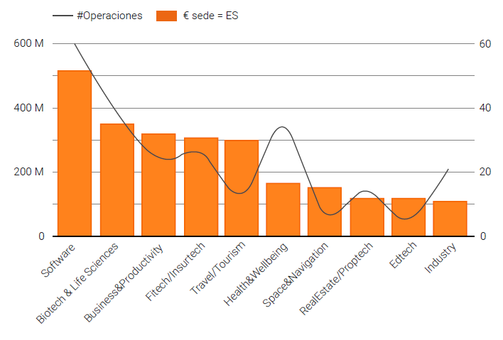 El liderazgo sectorial por volumen de inversión corresponde a software, impulsado por proyectos de inteligencia artificial, alcanzando 516 millones de euros.