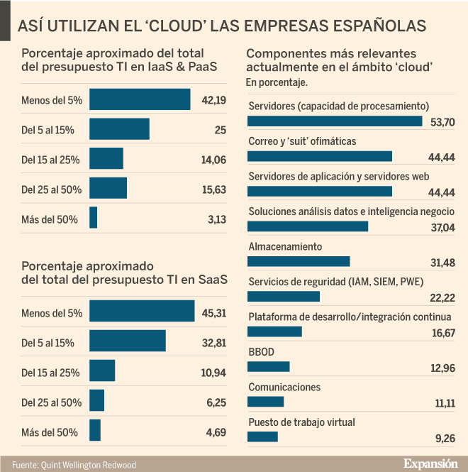 El grado de adopción en la empresa española sigue siendo bajo (las empresas que destinan menos del 15% de presupuesto de TI al Cloud Computing representan aún el 58% para la parte de IaaS/PaaS y el 75% para la de SaaS).
