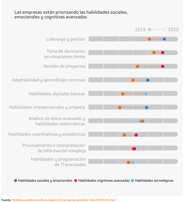 A todo ello, hay que añadir la importancia creciente de los soft skills: en un mundo cada vez más digitalizado e interconectado, las empresas están priorizando que los empleados tengan formación en habilidades sociales, emocionales y cognitivas avanzadas, como muestra la siguiente figura: