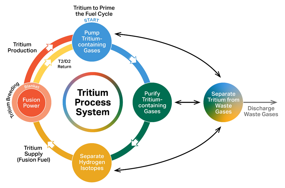 Una vez inyectado, solo una parte del tritio se quema. El resto sale junto con otros gases como deuterio no reaccionado, helio y pequeñas cantidades de hidrógeno. Todo este gas debe ser capturado eficientemente para su reutilización.